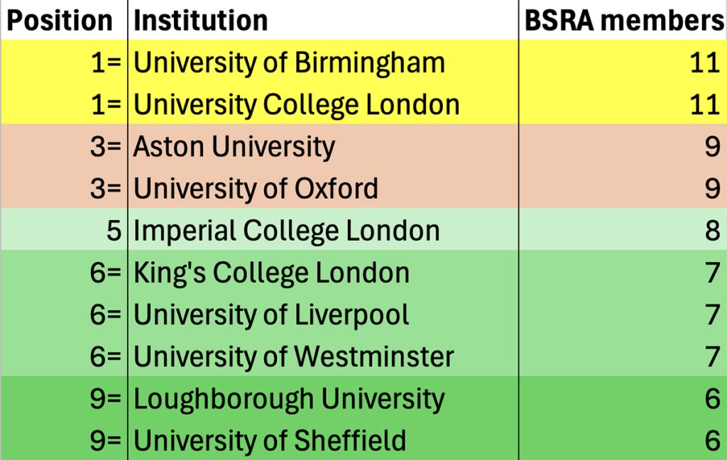 To attempt to quantify and map research in the UK, we used data from the BSRA membership. 56 UK institutions have at least one BSRA member, showing an incredibly wide distribution. UCL and the University of Birmingham top the table with 11 members, and the University of Oxford and Aston University are close behind with 9 each. The rest in the top 10 are Imperial College, King’s College London, Universities of Liverpool, Westminster, Sheffield and Loughborough.