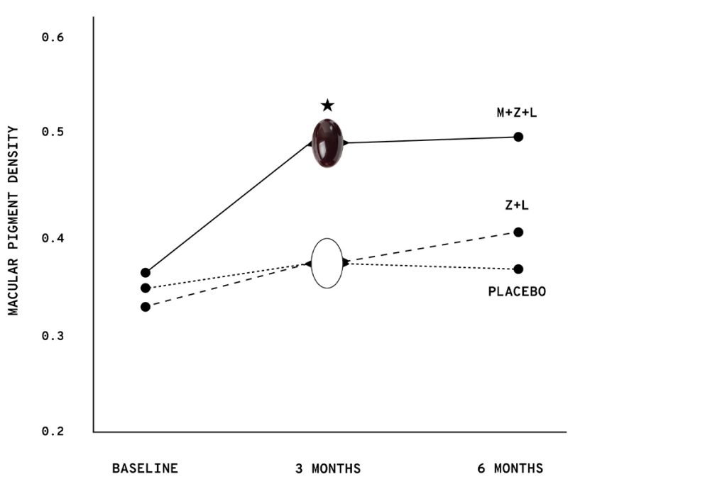 Supplementation with all three macular carotenoids (M+Z+L) in Vision by Elysium Health resulted in a significant increase in macular pigment density compared to supplementation with Z+L (provided by AREDS 2) or placebo. *P < 0.05. Adapted from Loughman et al., 2012
