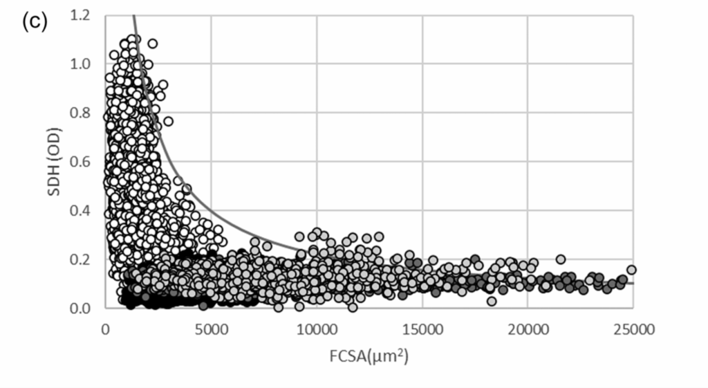 Figure: The relationship between muscle fiber oxidative capacity and cross-sectional area follows a consistent curve. Succinate dehydrogenase (SDH), a measure of oxidative capacity, and fiber cross-sectional area (FCSA) were plotted across samples from mice (white circles), recreationally active humans (black circles), and highly resistance-trained men before (dark gray circles) and after (light gray circles) a 10-week endurance training program. From Degens et al. 2025.1