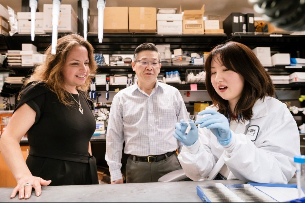 A team of scientists – including Marina Sirota (left), Yadong Huang (center) and Yaqiao Li (right) – identified two FDA-approved cancer medications that reduced brain degeneration in mice. (Credit: Michael Short/Gladstone Institutes)